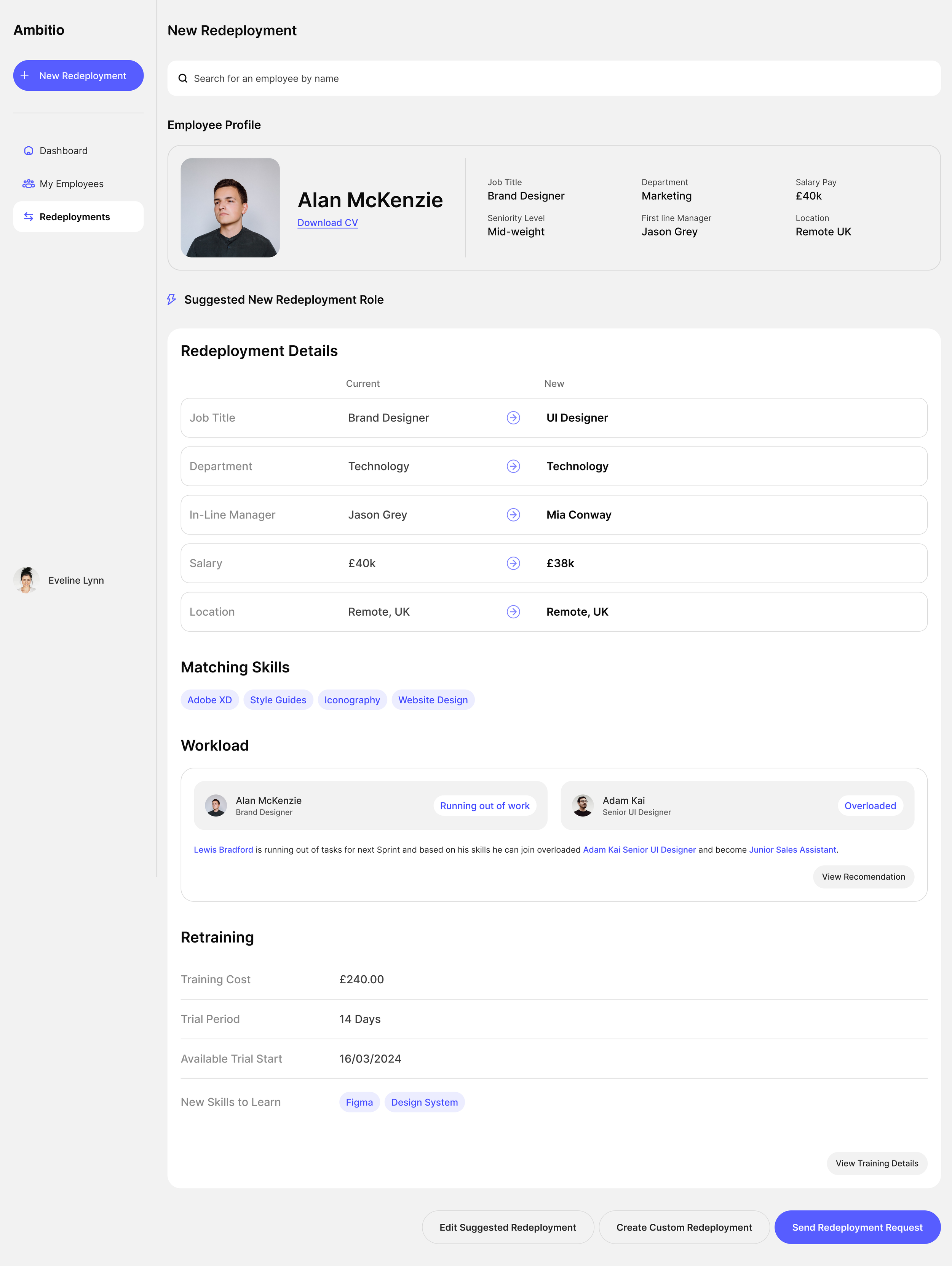 Dashboard: A summary view of workforce redeployments, redeployment recommendations and take off to redeployment journey.